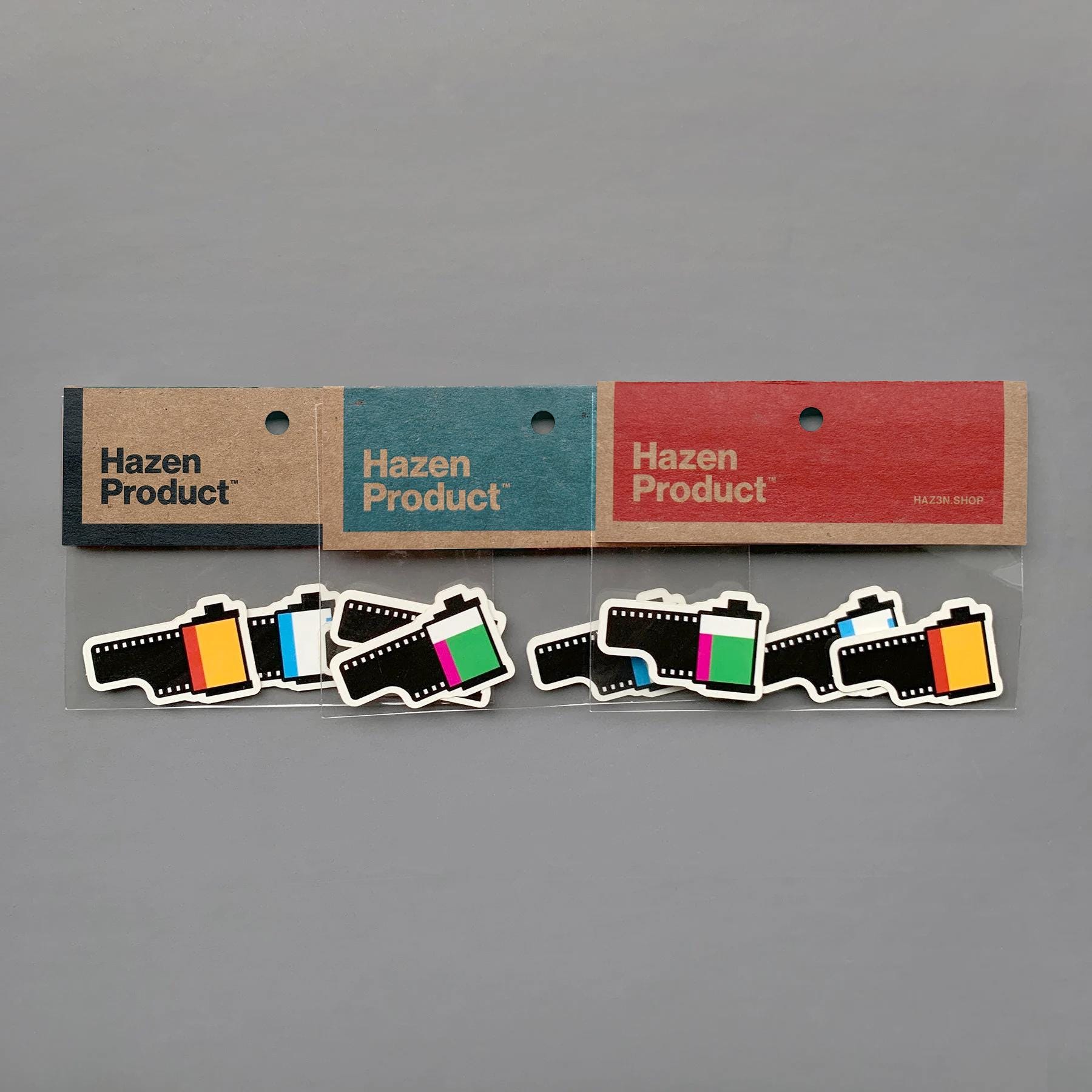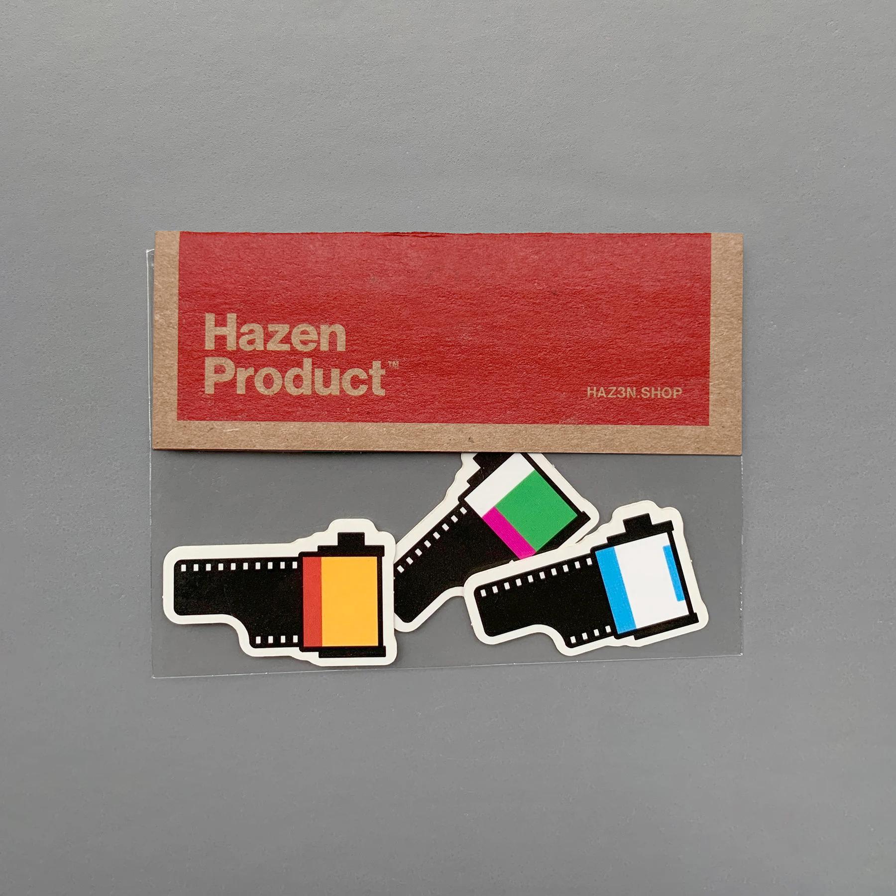 3 stickers depicting very simplified graphics of the classic film brands, which shall remain nameless. 1.6 x 1."