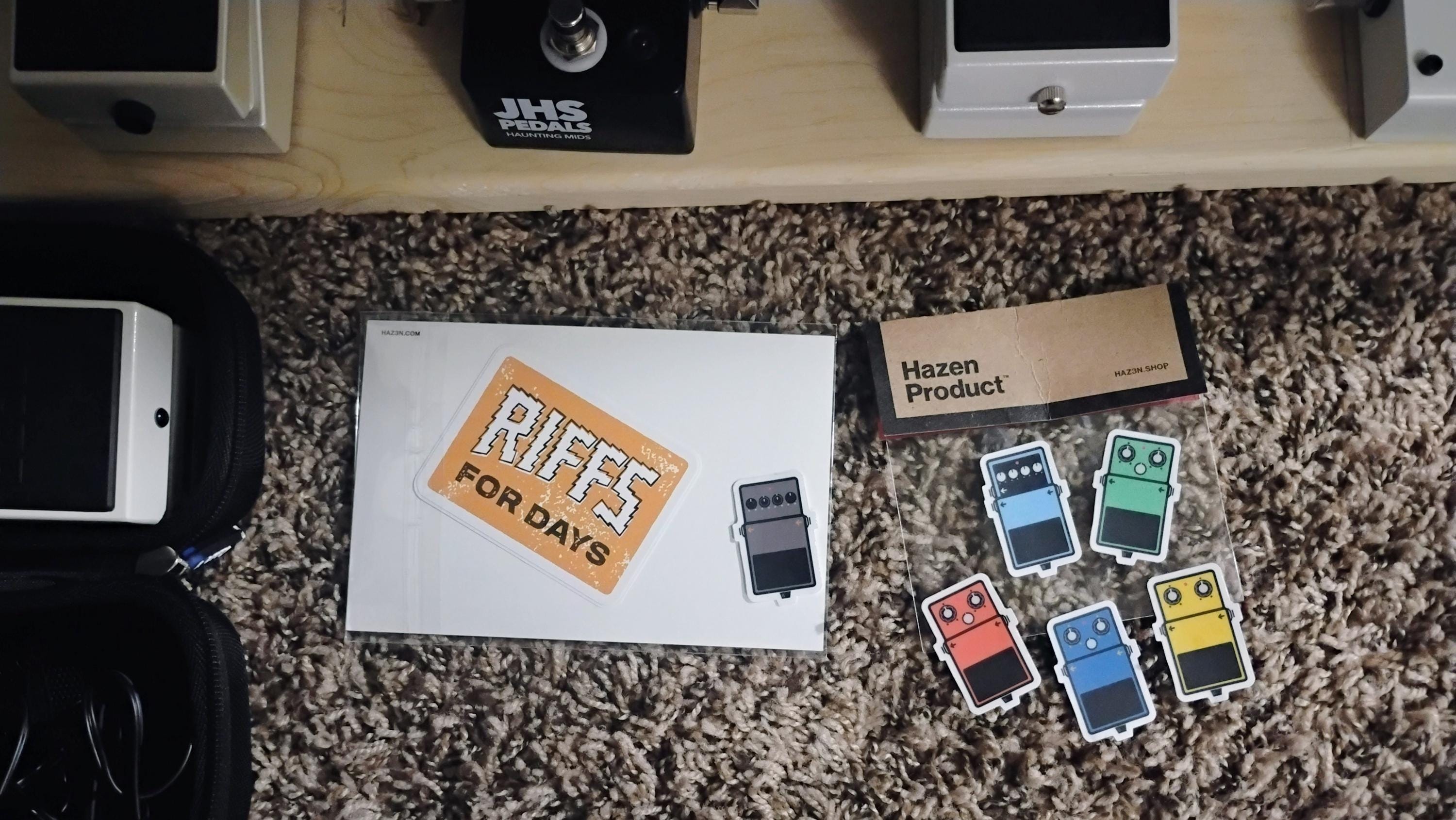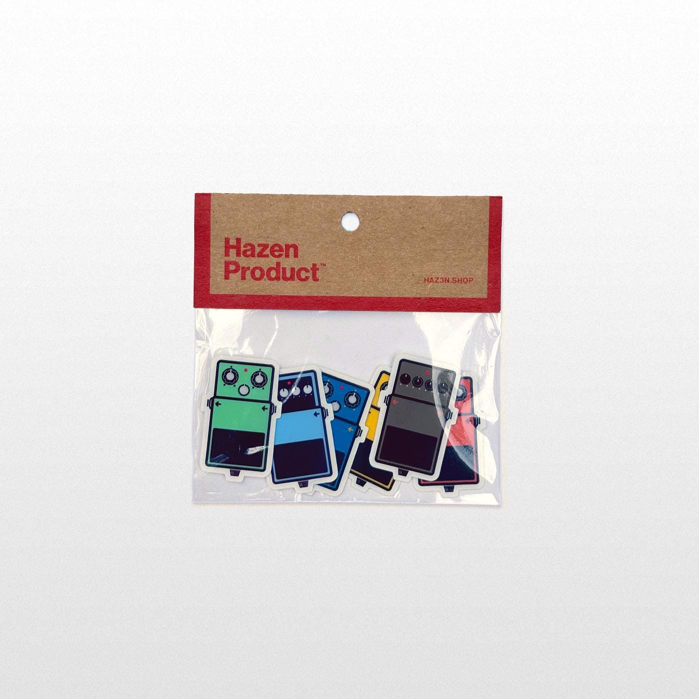 6 of the most well-known guitar pedals from a classic brand, who shall remain nameless. Each opaque sticker is printed on clear vinyl, and is 1" x 1.625".