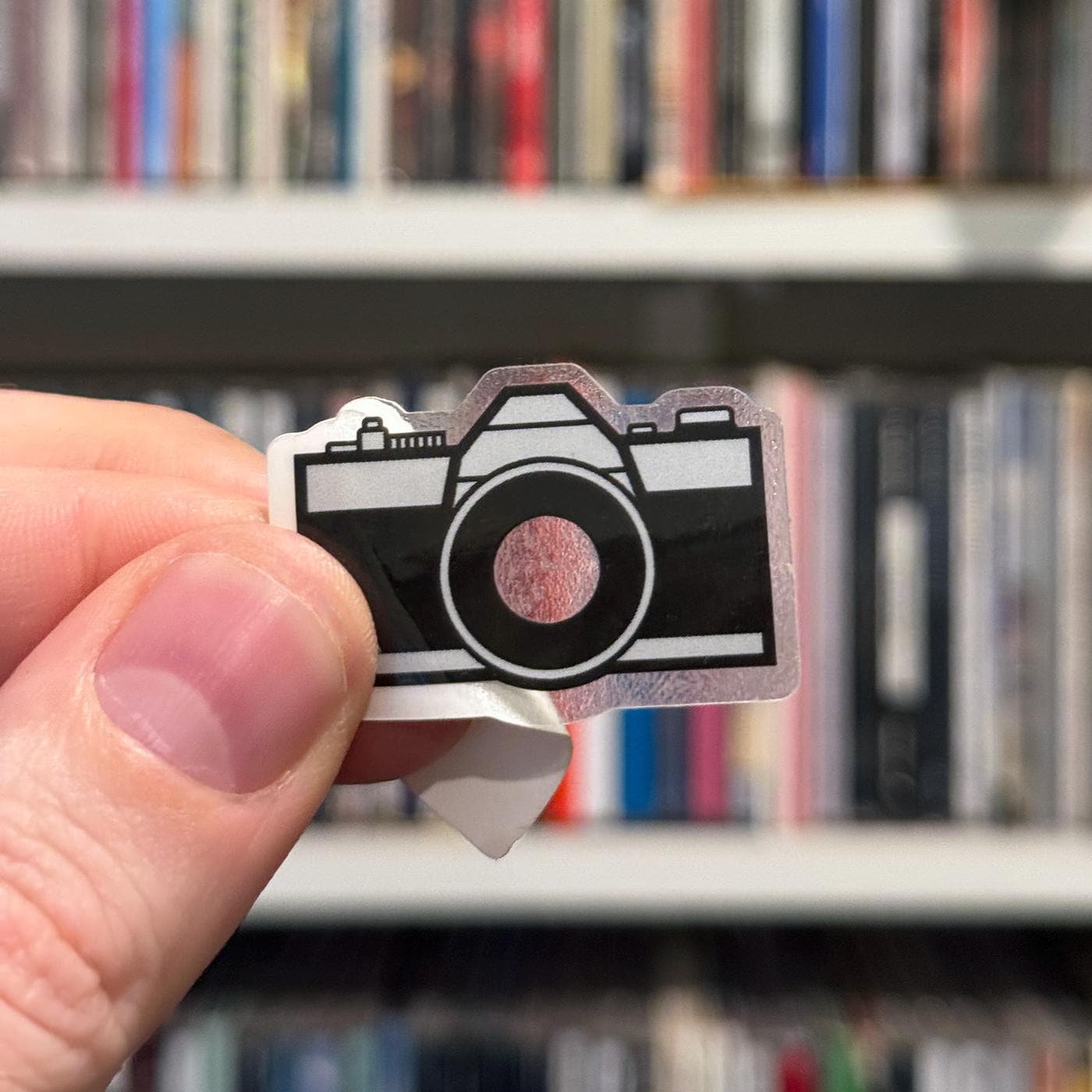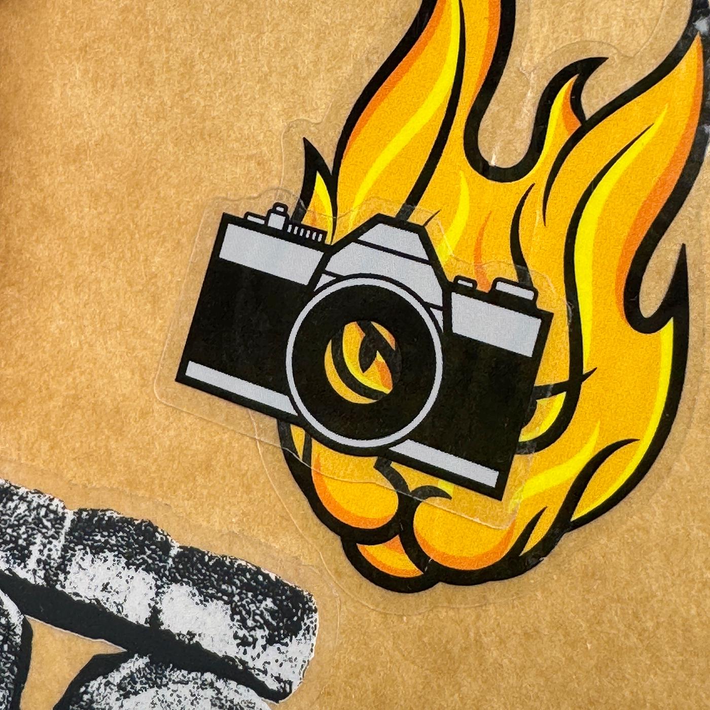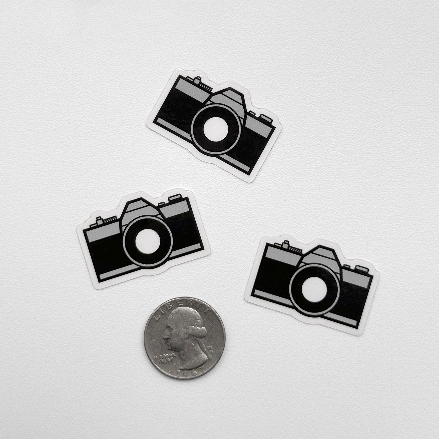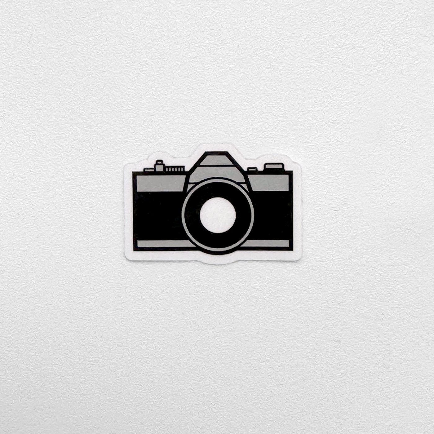 Vinyl sticker with a vintage camera graphic, opaque with a clear lens, so the background shows through. The sticker is just under 1.5" wide, and the graphic itself is about 1.25" wide.
