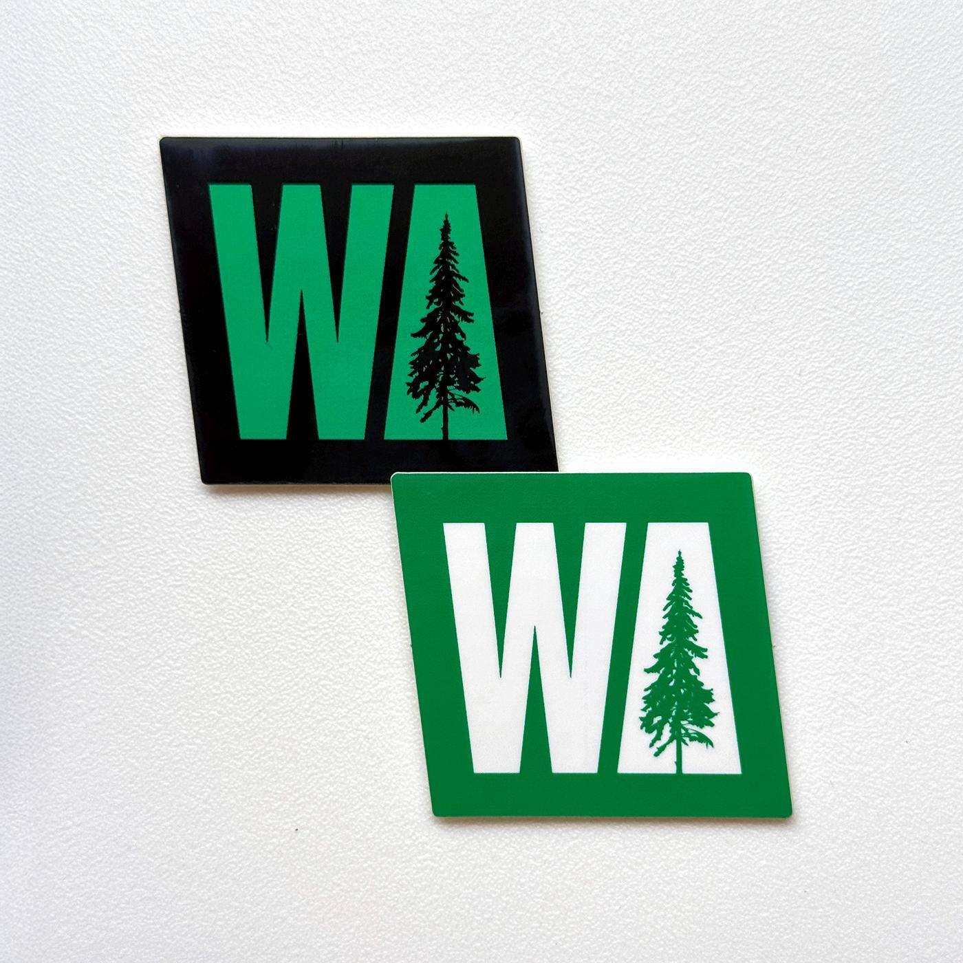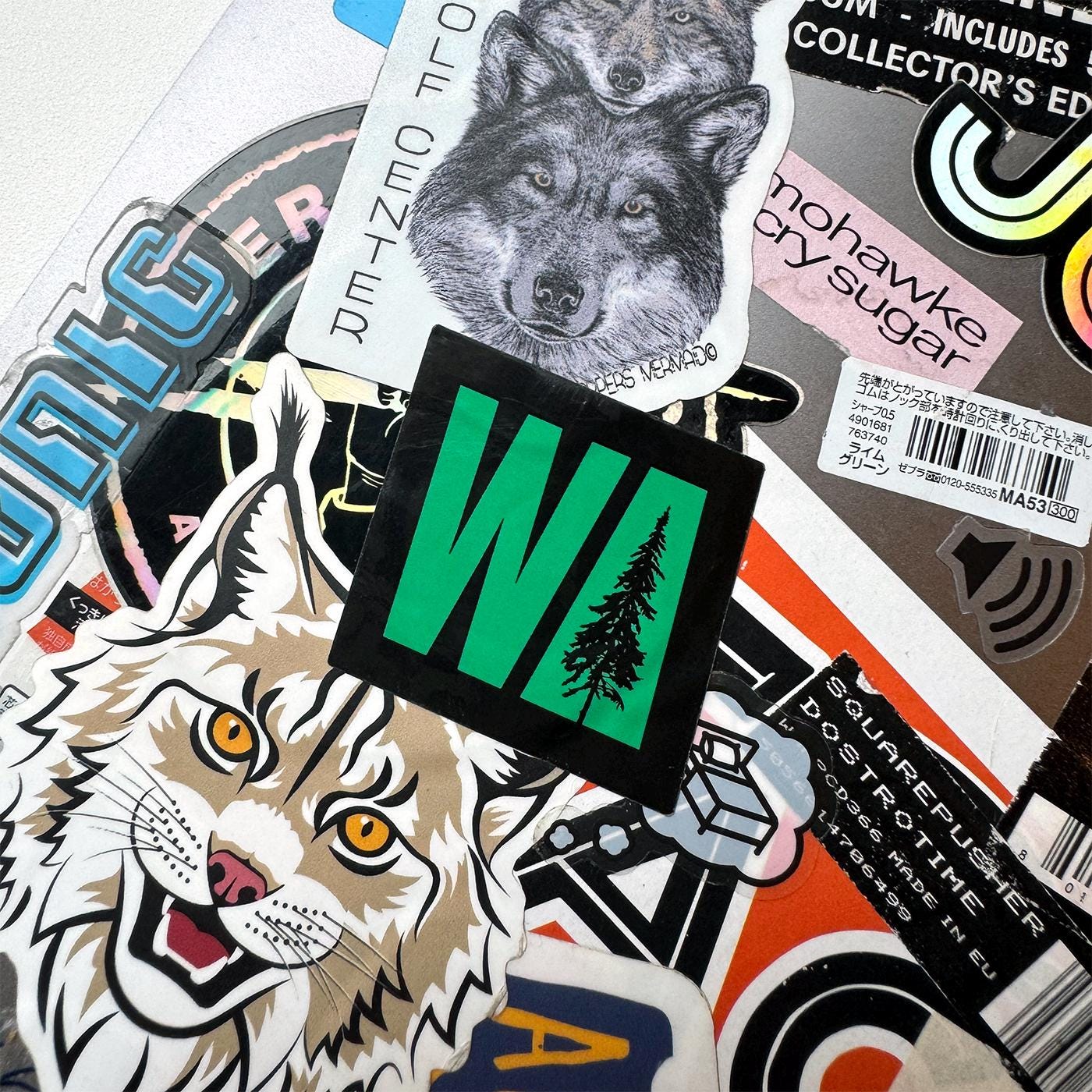 WA. Vinyl sticker in black on green or green on black. 1.75" wide 1.5 tall.