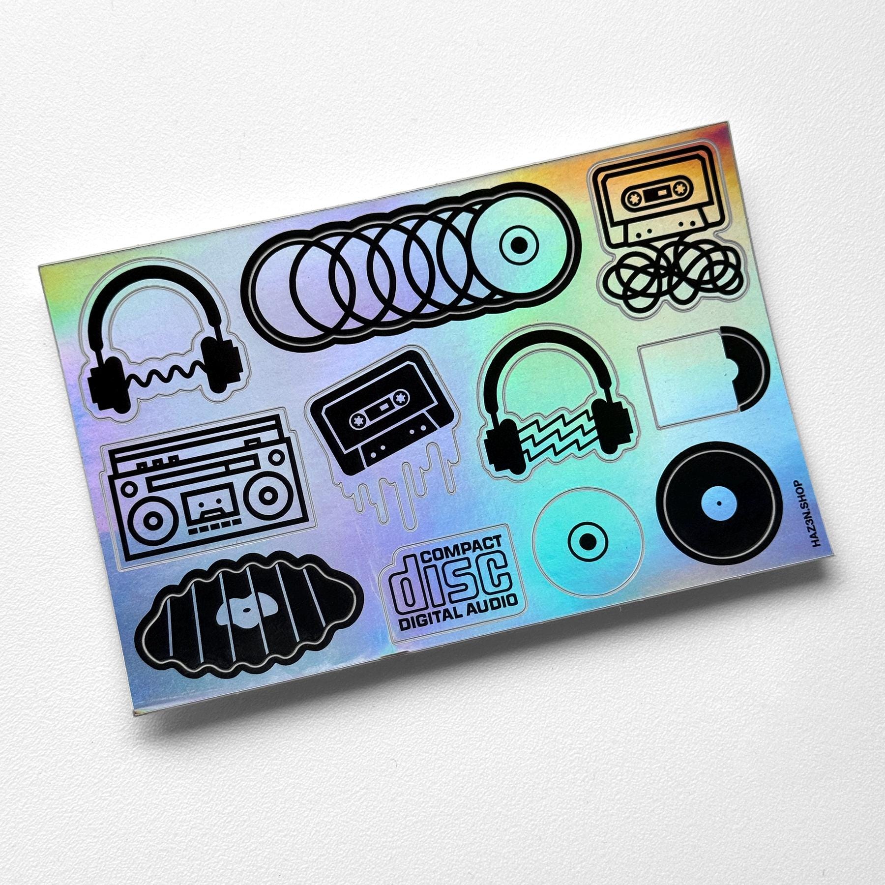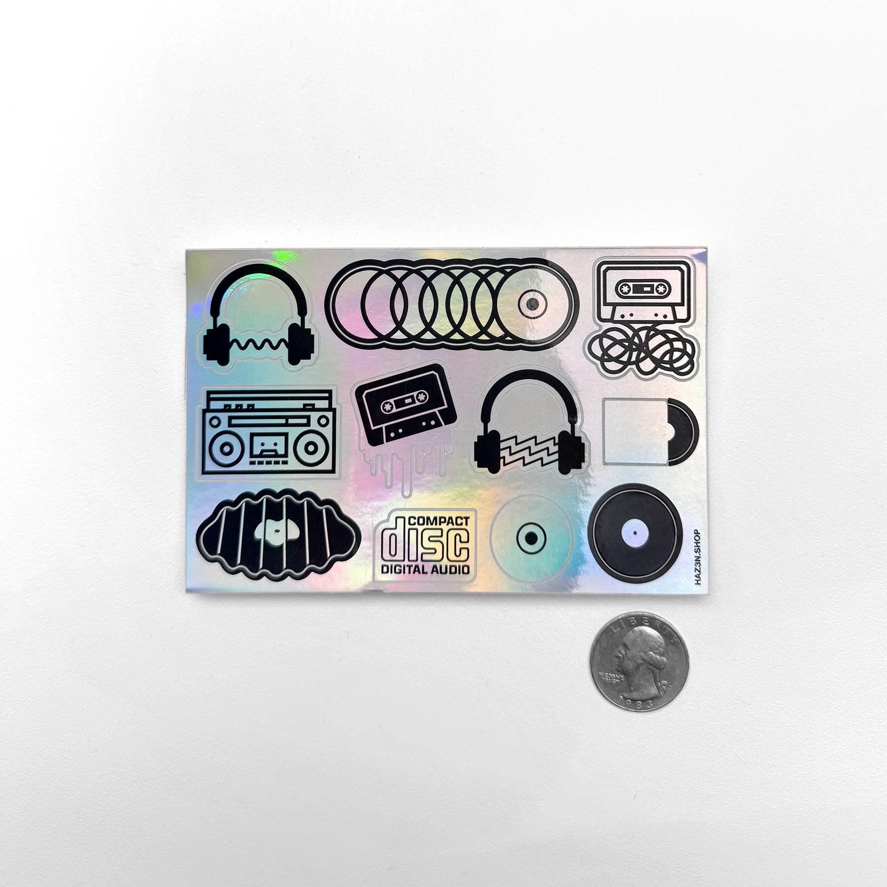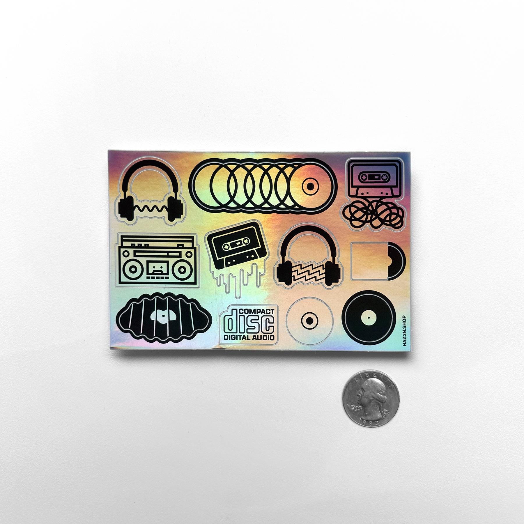For the analog music lover. A 5.125" x 3.3125" sheet with 11 holographic foil stickers. Super minimal designs: three different vinyl records, two different CDs and the Compact Disc logo, two different headphones, two different cassettes, and a boombox.