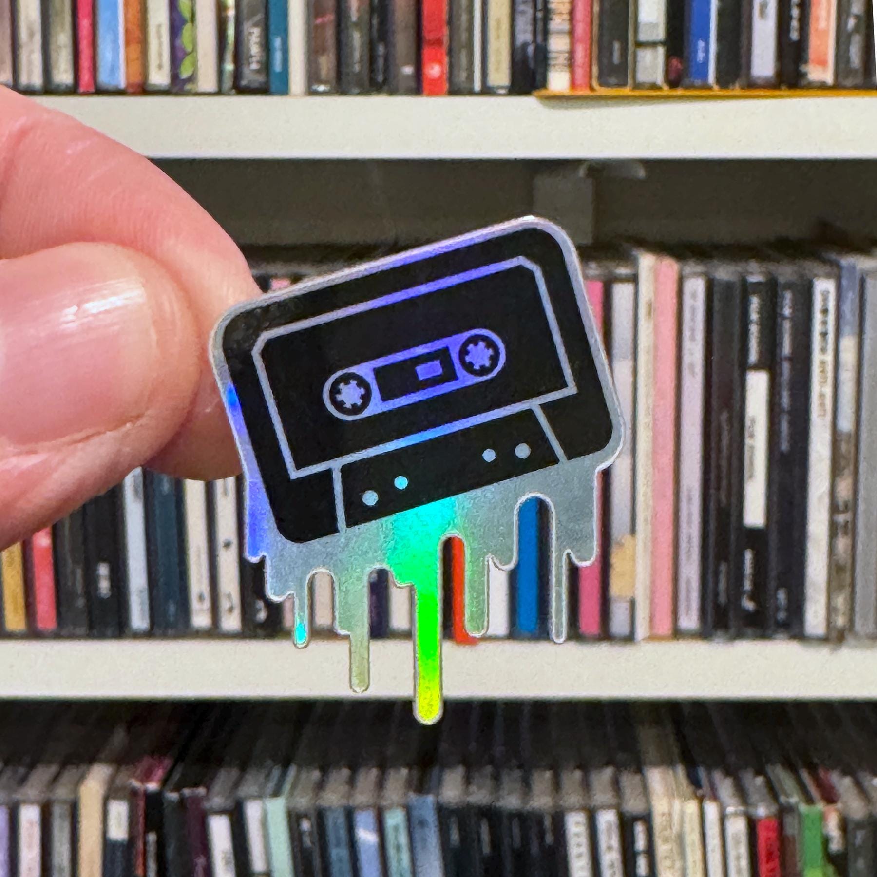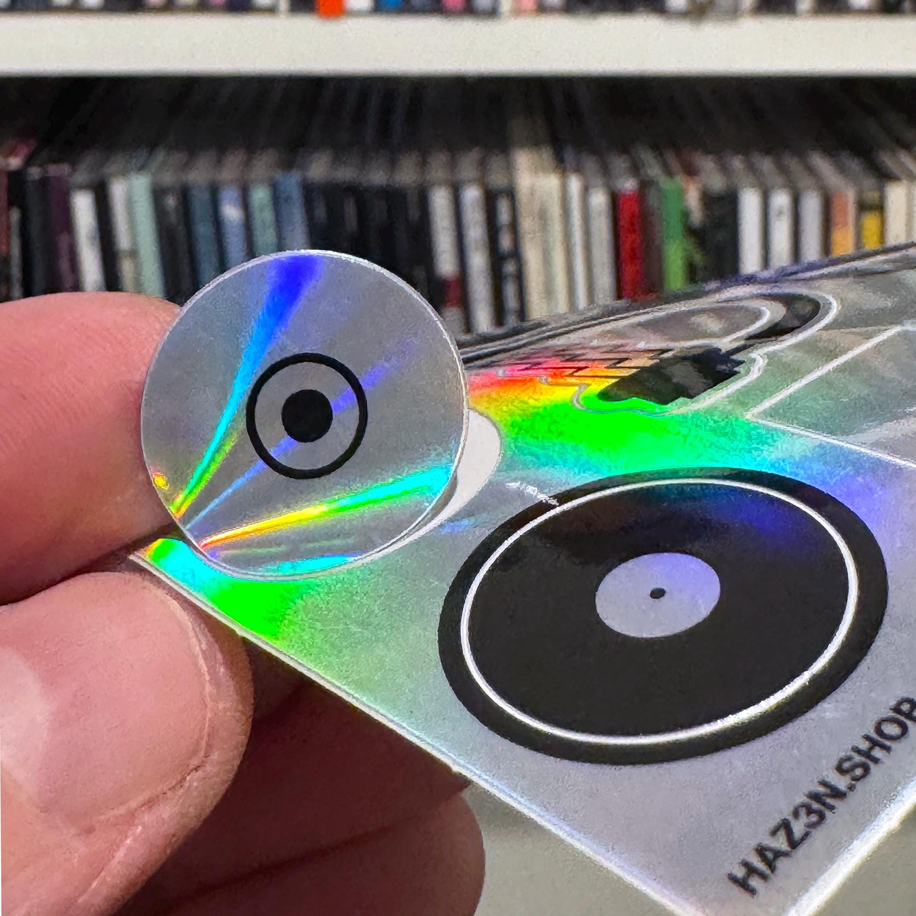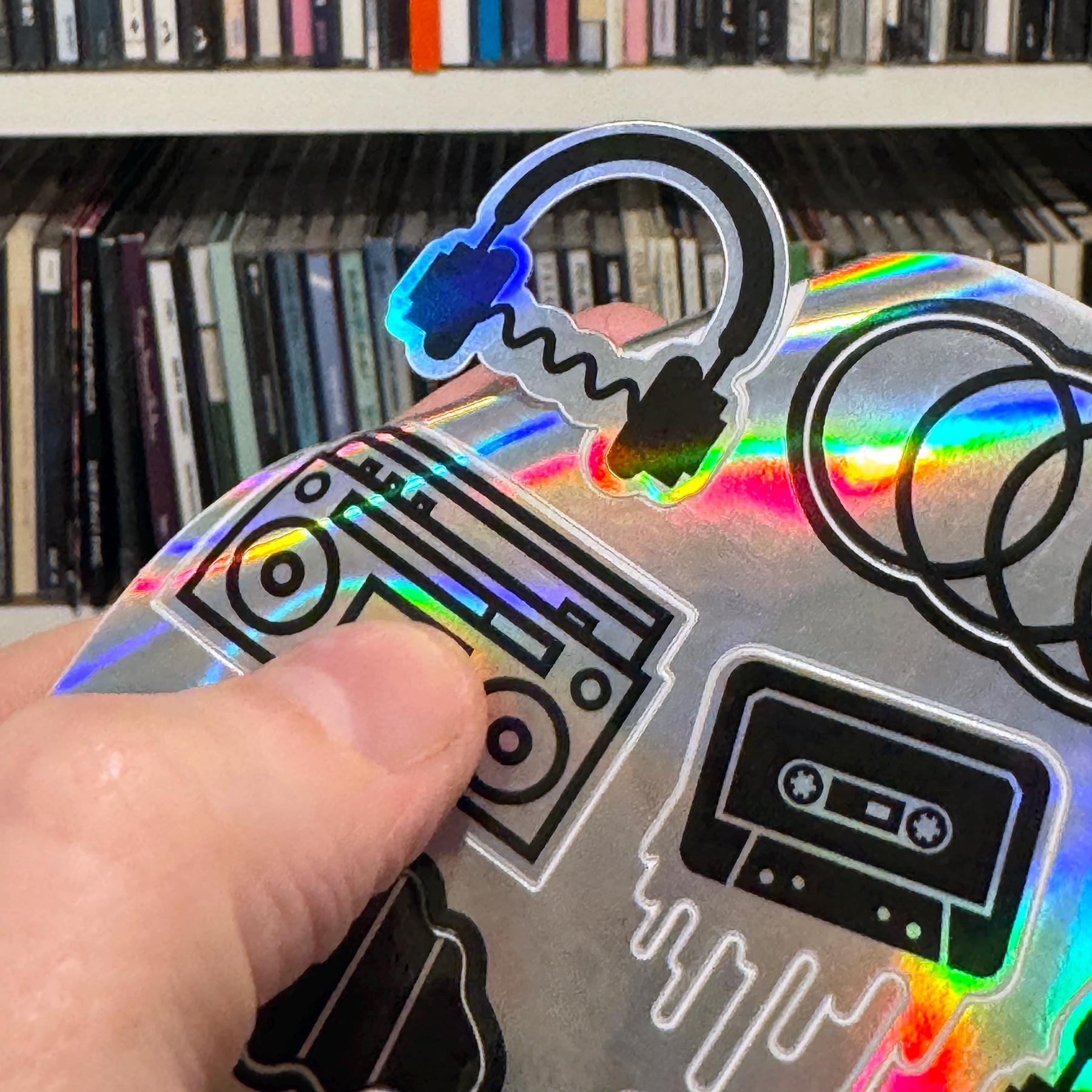 For the analog music lover. A 5.125" x 3.3125" sheet with 11 holographic foil stickers. Super minimal designs: three different vinyl records, two different CDs and the Compact Disc logo, two different headphones, two different cassettes, and a boombox.
