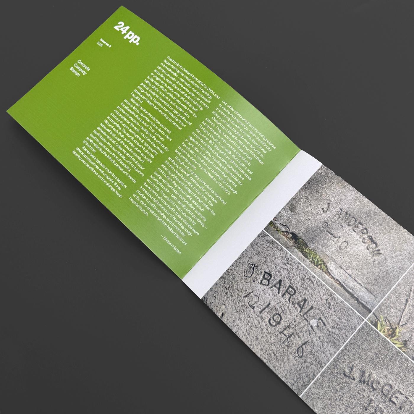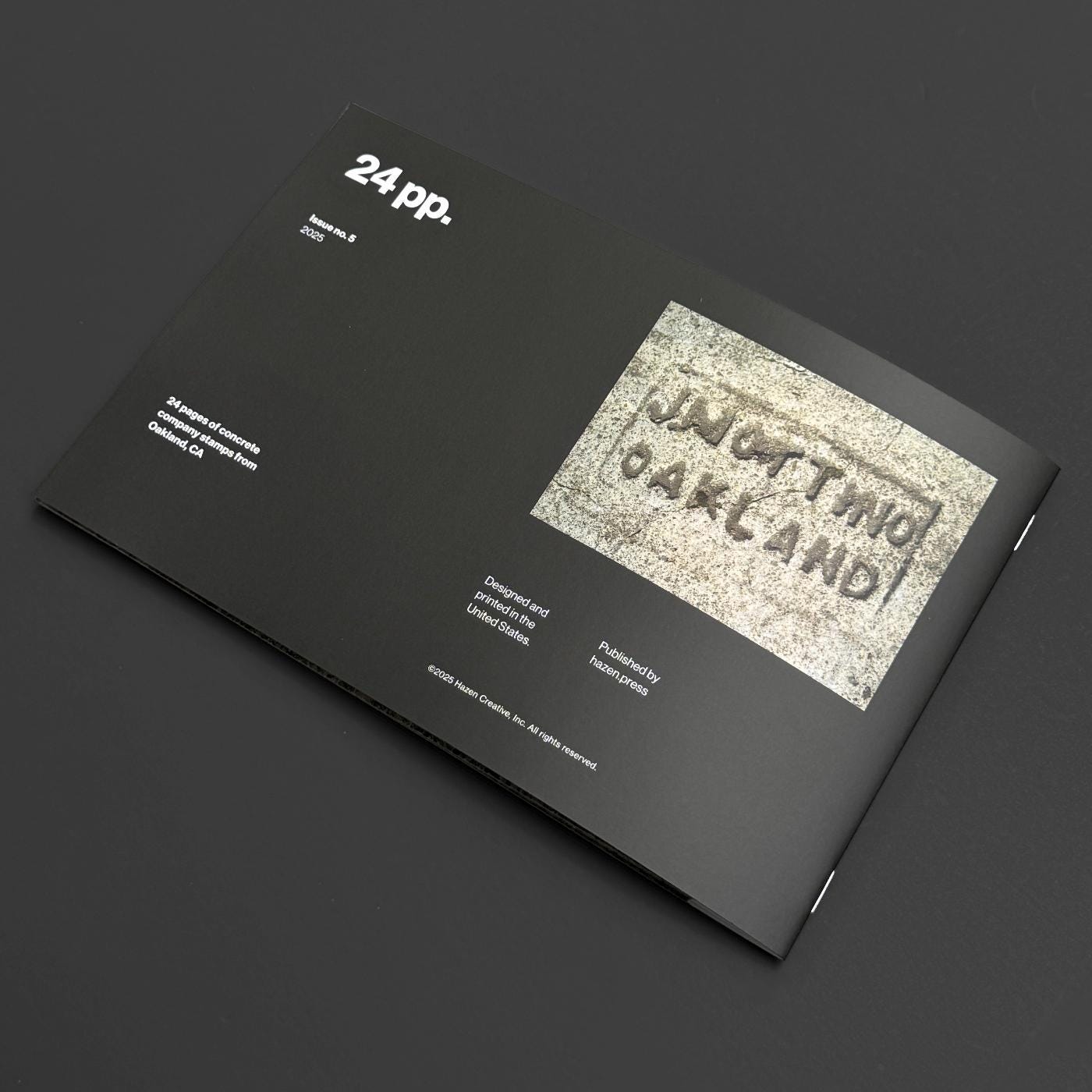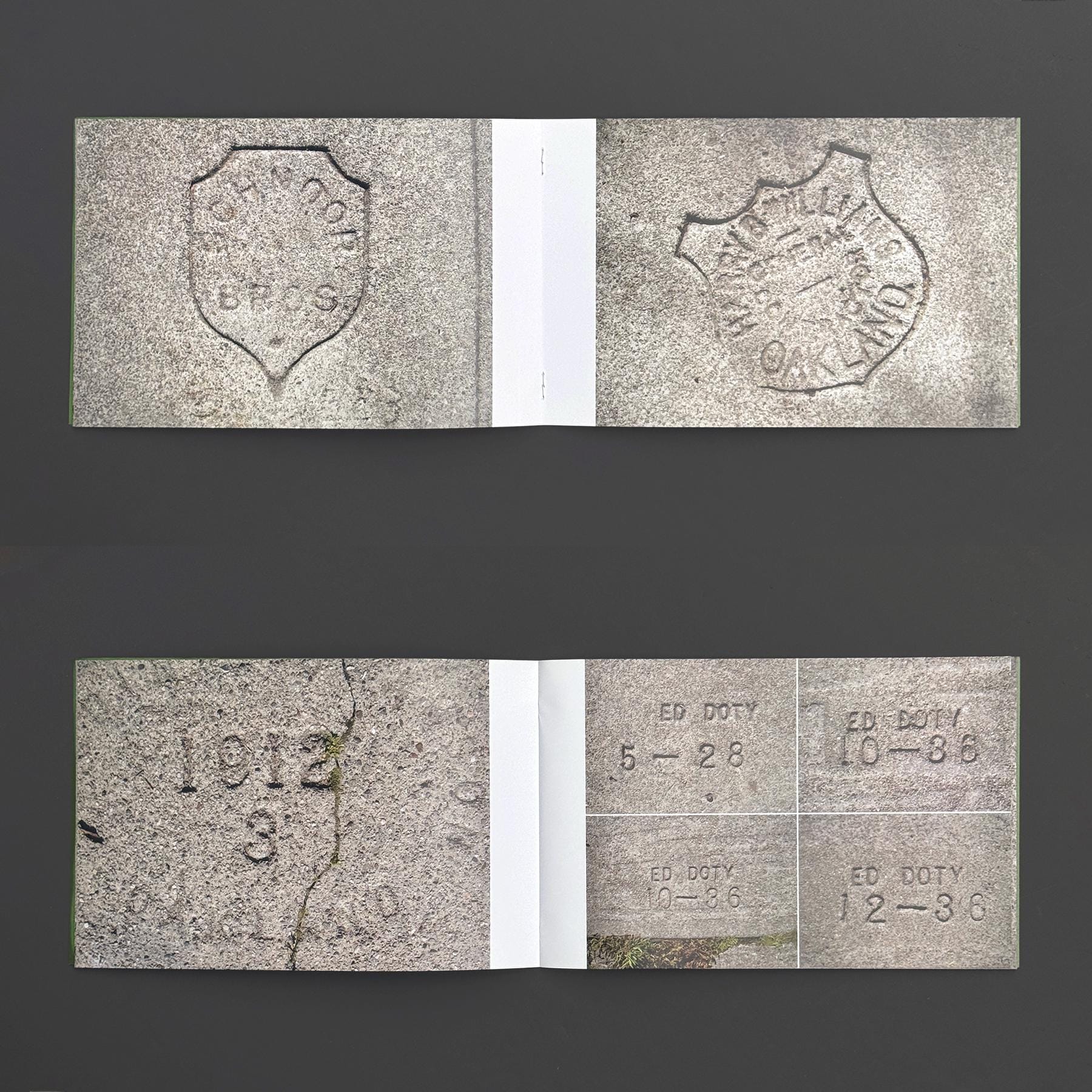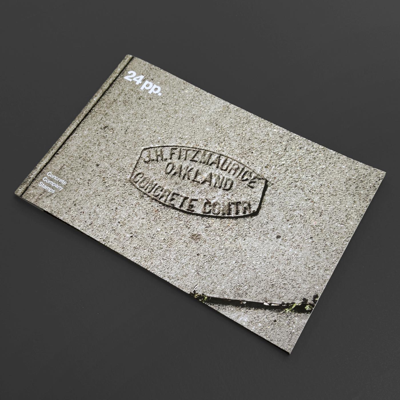 A zine reproducing a series of 29 photographs of concrete company stamps in Oakland, CA. Featuring a short essay examining the history and design of these brand marks. This zine is professionally printed, 8.5 in. × 5.5 in. (size when closed), saddle stitched, 4-color printing, 28 pages incl. cover, 80lb Satin Text, 100lb Satin Cove with Matte Lamination.